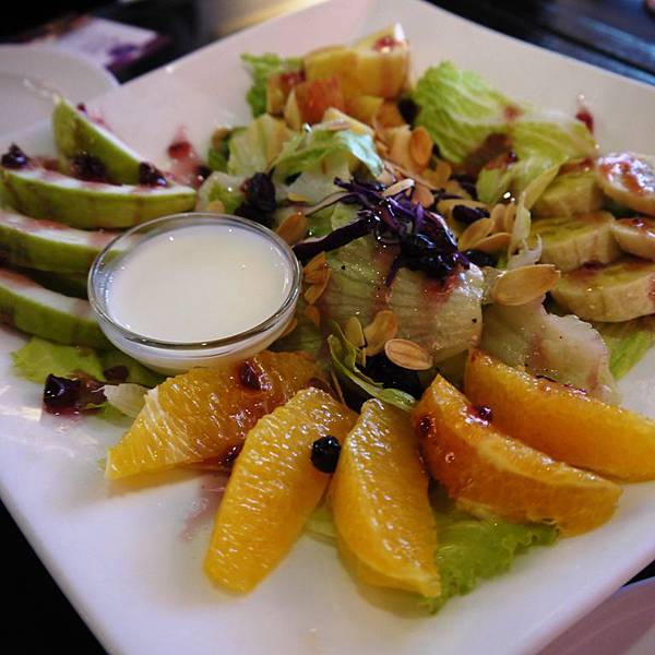 滿滿的生菜加上豐富的水果,撒些葡萄乾、杏仁片,最後淋上蔓越莓醬