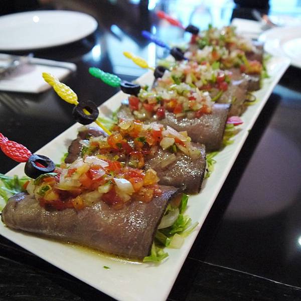 牛肉包覆蔬菜絲,淋上清爽的塔塔醬,搭配橄欖提味