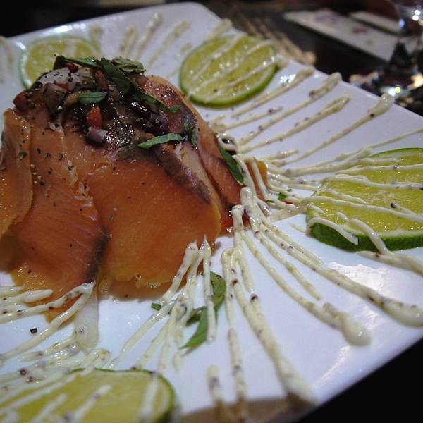 鮭魚上方淋上法式洋蔥芥籽醬,而下方躺了洋蔥絲,要一起食用才夠味啦~~