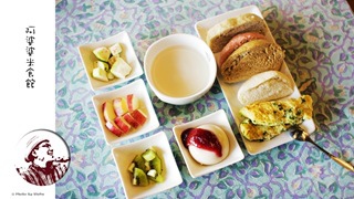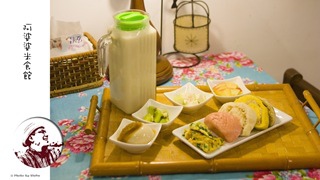 布雷克到池上的兩天都是住在池上民宿「莊稼熟了」,這間民宿也是與阿婆婆有配合,因此兩天的早餐都是阿婆婆米食館的米饅頭早餐。整個早餐看起來就非常的豐盛,三盤季節水果,一大塊的蔥蛋,一個米布丁,與可以喝到爽的米漿,還有四片不一樣的顏色的米饅頭(不是五色嗎?下次去的時候再問一下婆婆好了)